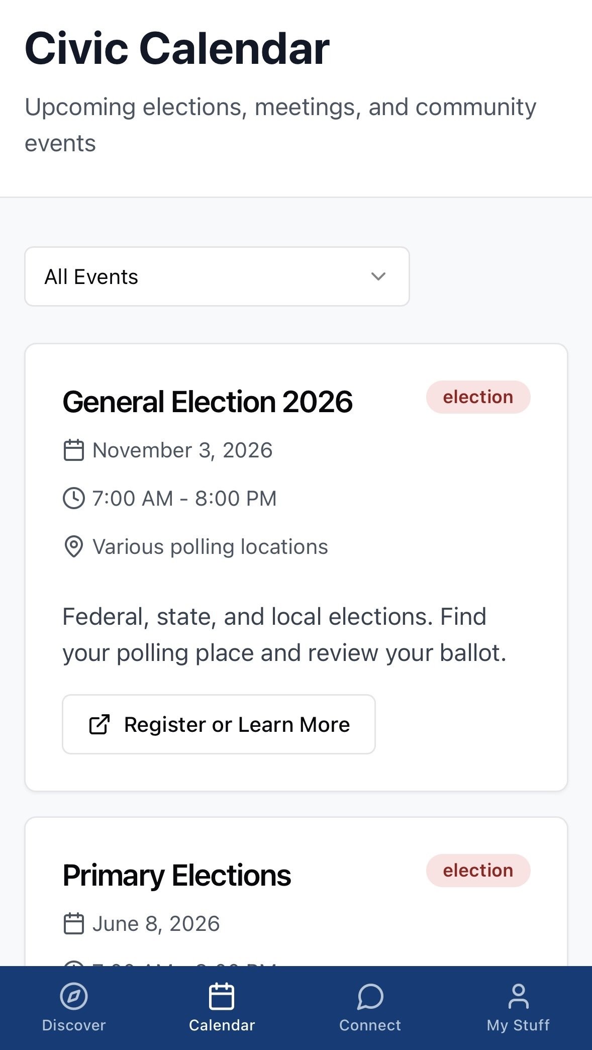 Votary is like Tinder for learning about politics — built to make civic engagement non-partisan, personal, approachable, and meaningful. Instead of swiping on people, you’re swiping through candidates, issues, and local events to discover what matters most to you. Explore upcoming elections with our calendar, take intro surveys to understand your voter profile, join guided dialogues that foster real conversation, and share your voice through polls and community insights.